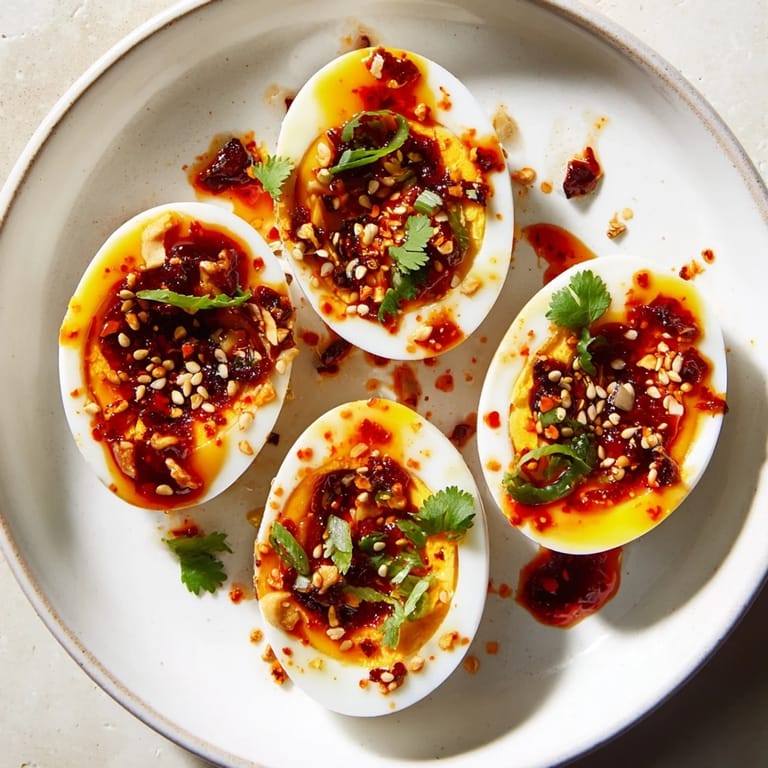 - Halve each egg lengthwise and arrange them cut-side up on a plate like they deserve to be admired. Spoon the chili oil mixture generously over the top so every bite gets that spicy, fragrant coating.