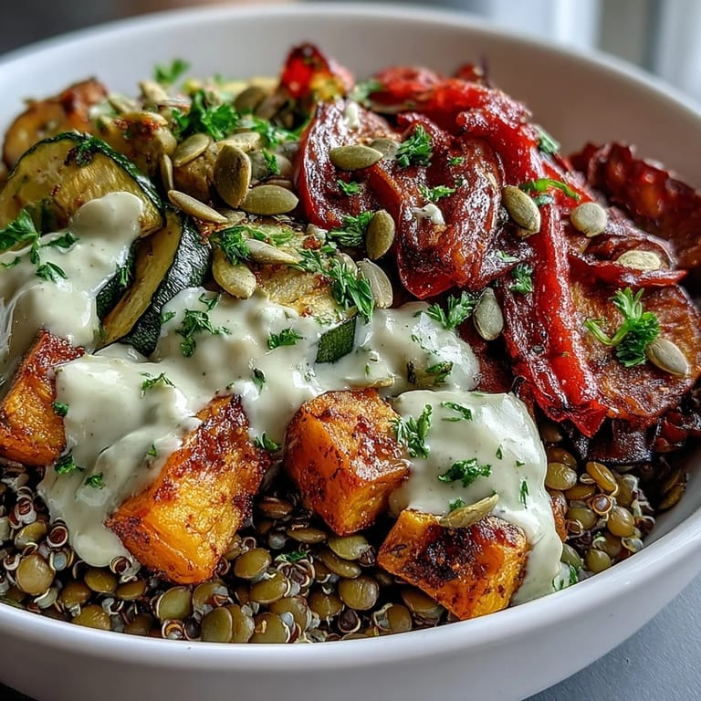 Save Embrace a meal that is as vibrant as it is nourishing with this Lentil Power Bowl. This dish is a celebration of plant-based goodness, bringing together earthy lentils, fluffy grains, and the natural sweetness of caramelized roasted vegetables. Finished with a velvety tahini dressing, it offers a harmonious blend of textures and flavors that will leave you feeling energized and satisfied.